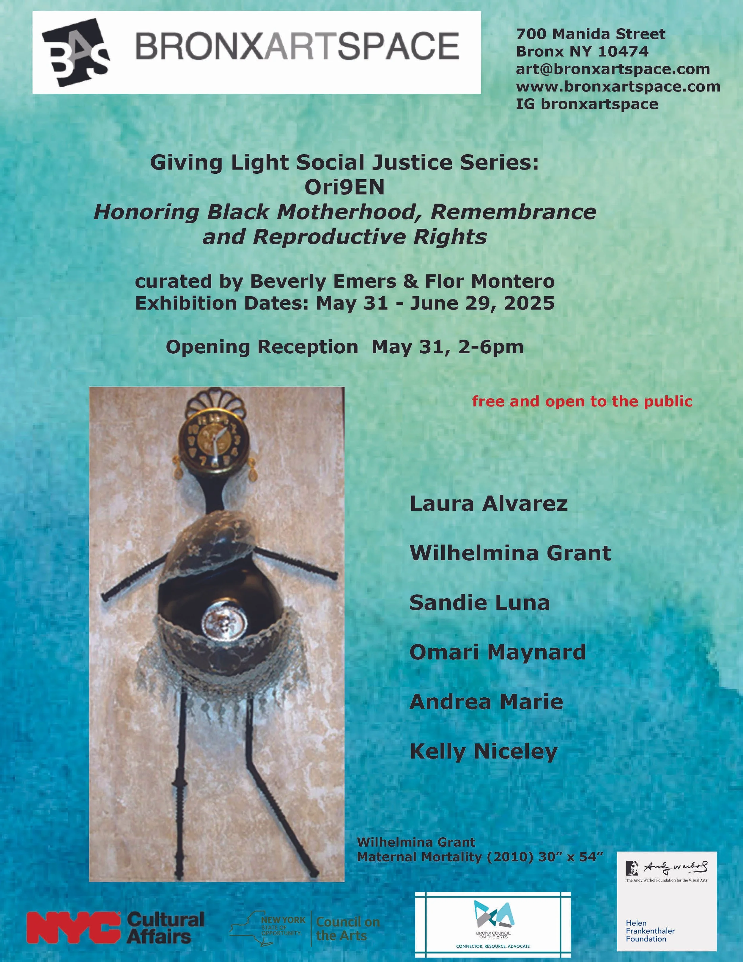 BronxArtSpace presenta Ori9EN, una respuesta a la crisis de salud Materna Negra. Una exposición de arte y espacio comunitario profundamente enraizado que honra lo sagrado de la maternidad negra y celebra el poder de la memoria ancestral, la justicia del parto y el cuidado colectivo. Esta experiencia multidisciplinaria reúne a artistas, trabajadoras de parto y parteras, sanadoras comunitarias y familias del Bronx para centrar la salud materna como un Derecho Humano y legado sagrado.