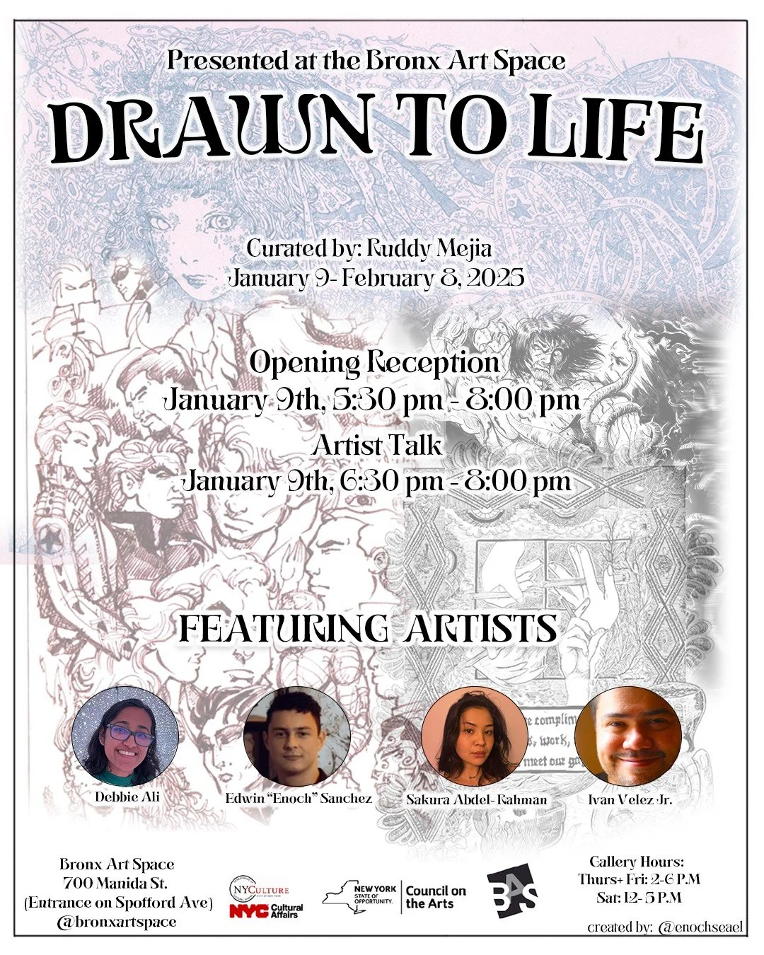 Exhibiting artists include Debbie Ali, Sakura Abdel-Rahman, Edwin "Enoch" Sanchez, Ivan Velez Jr.